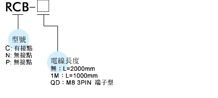 | 接点型式 | RCB: 有接点, RNB: 无接点 NPN, RPB: 无接点 PNP |